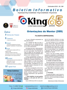 [email protected] kingcontabilidade company/kingcontabilidade B o l e t i m I n f o r m a t i v o Dezembro/ 2025 - Ed. 398 FILOSOFIA EMPRESARIAL Índice 2 Notícias dos Tribunais 5 Financeiro • Aviso de vencimentos 6 Pessoal • Empresas Prestadoras de Serviço – Aspectos Trabalhistas e Previdenciários 8 Fiscal • Cartilha sobre emissão da NF-e no modelo do IBS • Reforma Tributária: São Paulo disponibiliza serviço teste do Webservice para emissão do novo layout da NFS-e 10 Contábil • Simple Nacional e ato de exclusão não regularizado no prazo. Exclusão 01.01.2026 • Encerramento do exercício social/fiscal 12 Agenda Fiscal